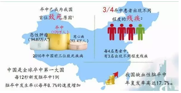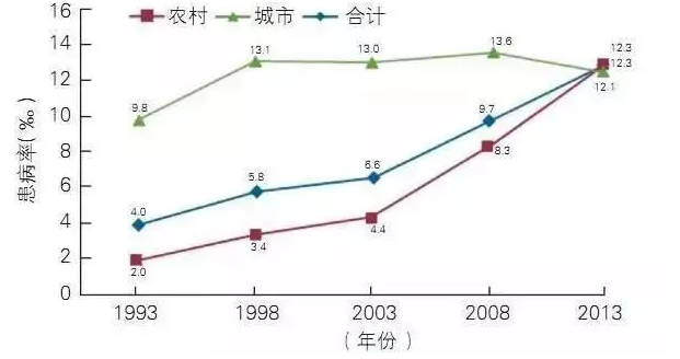 2017年6月,《中國心血管病報告2016》發(fā)布,報告概要刊登于中國循環(huán)雜志。國家衛(wèi)生服務調查結果顯示,1993~2013年期間,我國腦血管病患病率整體呈上升趨勢,以前是城市高于農村,但目前已經(jīng)發(fā)生逆轉。2013年的第五次調查顯示,城市腦血管病患病率(12.1‰)有所下降,農村(12.3‰)仍呈明顯的上升。腦卒中現(xiàn)患人數(shù)約1300萬,腦卒中給中國造成的經(jīng)濟負擔每年高達400億元。