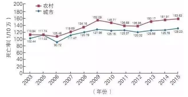 依據(jù)第六次人口普查數(shù)據(jù),2015年死于腦血管病的城鎮(zhèn)居民為85.36萬人,農村居民103.49萬人?傮w上看農村地區(qū)腦血管病死亡率高于城市地區(qū)。進一步分析表明,我國腦卒中死亡率下降的主要因素可能有以下幾種:1、中國整體醫(yī)療保障的改善;2、臨床診斷和救治技術的進步;3、城市居民腦卒中發(fā)病率下降;4、卒中防治知識水平的普遍提高。經(jīng)濟狀況與健康知識會影響患病率與死亡率:卒中患病率和不同教育水平呈負相關關系,即小學和以下文化卒中患病率最高,大專及以上最低。