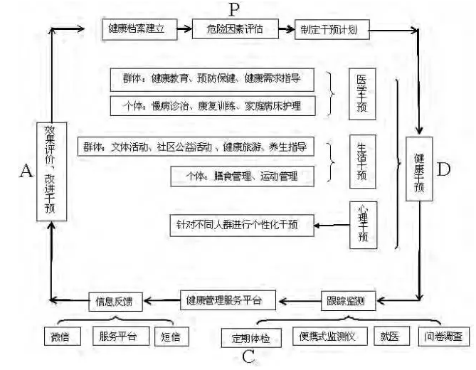 鮑勇將社區(qū)健康管理定義為: 對社區(qū)健康人群、疾病人群的健康危險因素進行全面監(jiān)測、分析、評估、預測、預防,維護和發(fā)展個人和家庭技能的全過程。